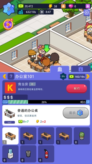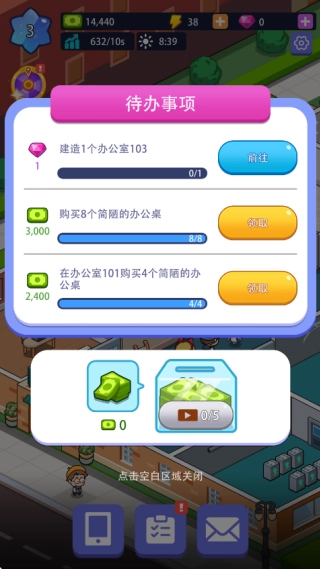 像图中展示的那样,玩家能够解锁不同种类的办公室,还能给办公室添加各类设施,一步步把办公室打造得更完善,从而持续获取更多金币!