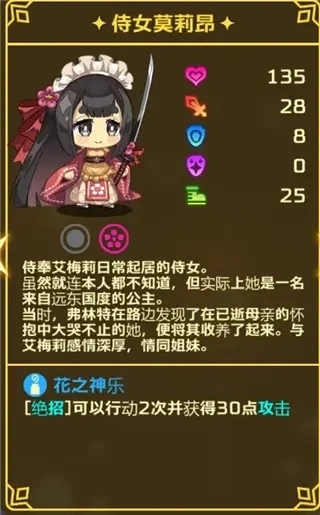 女仆定位高速输出,技能机制稳定触发两次攻击;若搭配梅纹羁绊还能实现回血效果,建议至少培养到2星,布阵时放置在靠后的位置。