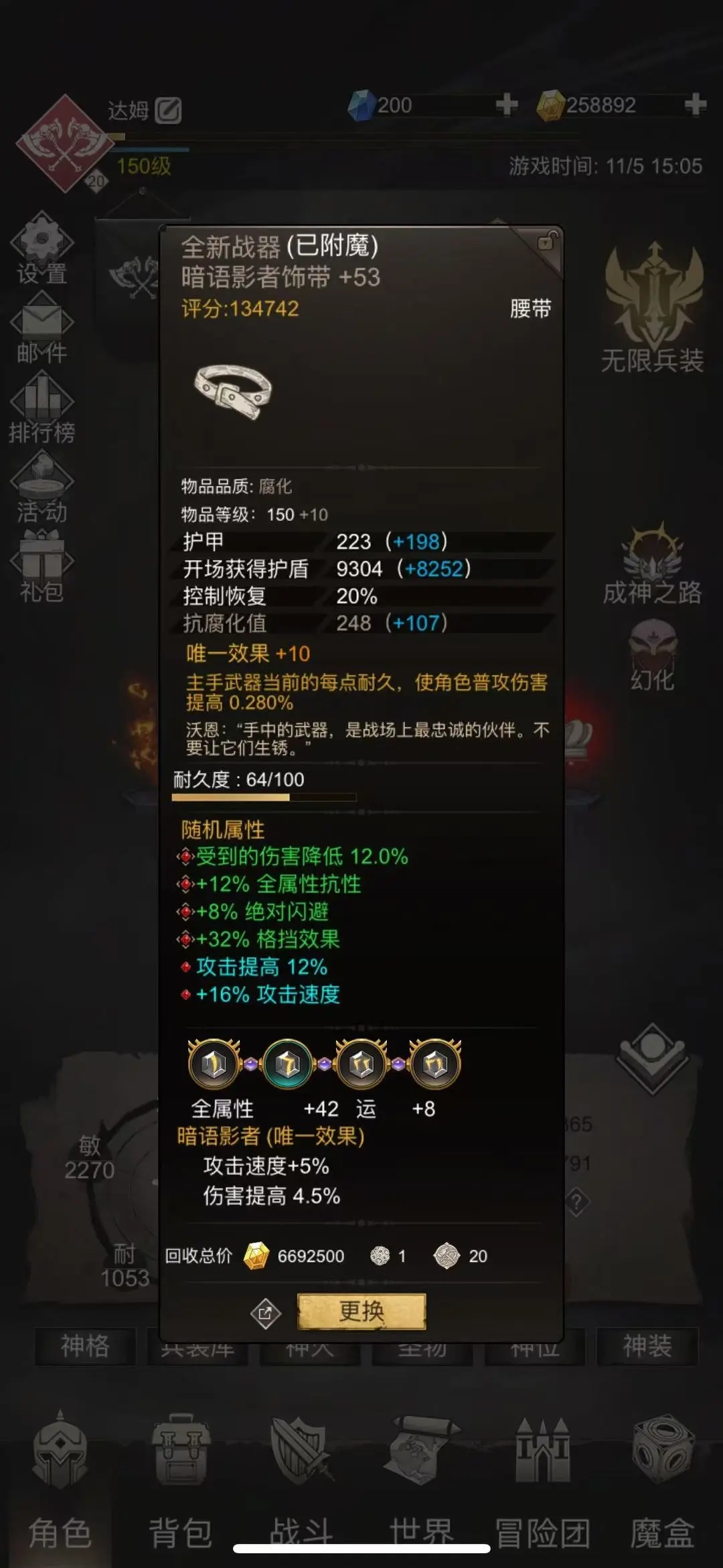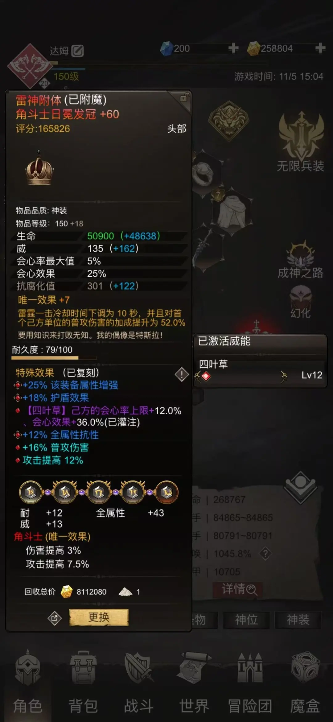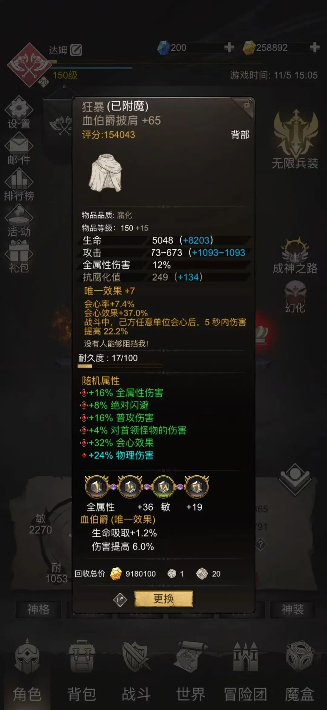 第五阶段会比前面轻松不少,毕竟第四阶段结束后已经拿到双套装,加上前四阶段在其他各方面的积累。这个阶段的核心任务是查漏补缺,进一步强化阵容:副职业要把暴走、时光穿梭、黑龙这类关键技能拿到手;词缀没满的话继续收集;装备持续更换成更强力的;武器等级也得接着提升。等打到最终BOSS关卡,如果本体坦度不够,就带双前排阵容;要是本体够硬,直接搭配暴走+时光穿梭/黑龙的组合,一波就能带走BOSS,顺利结束。