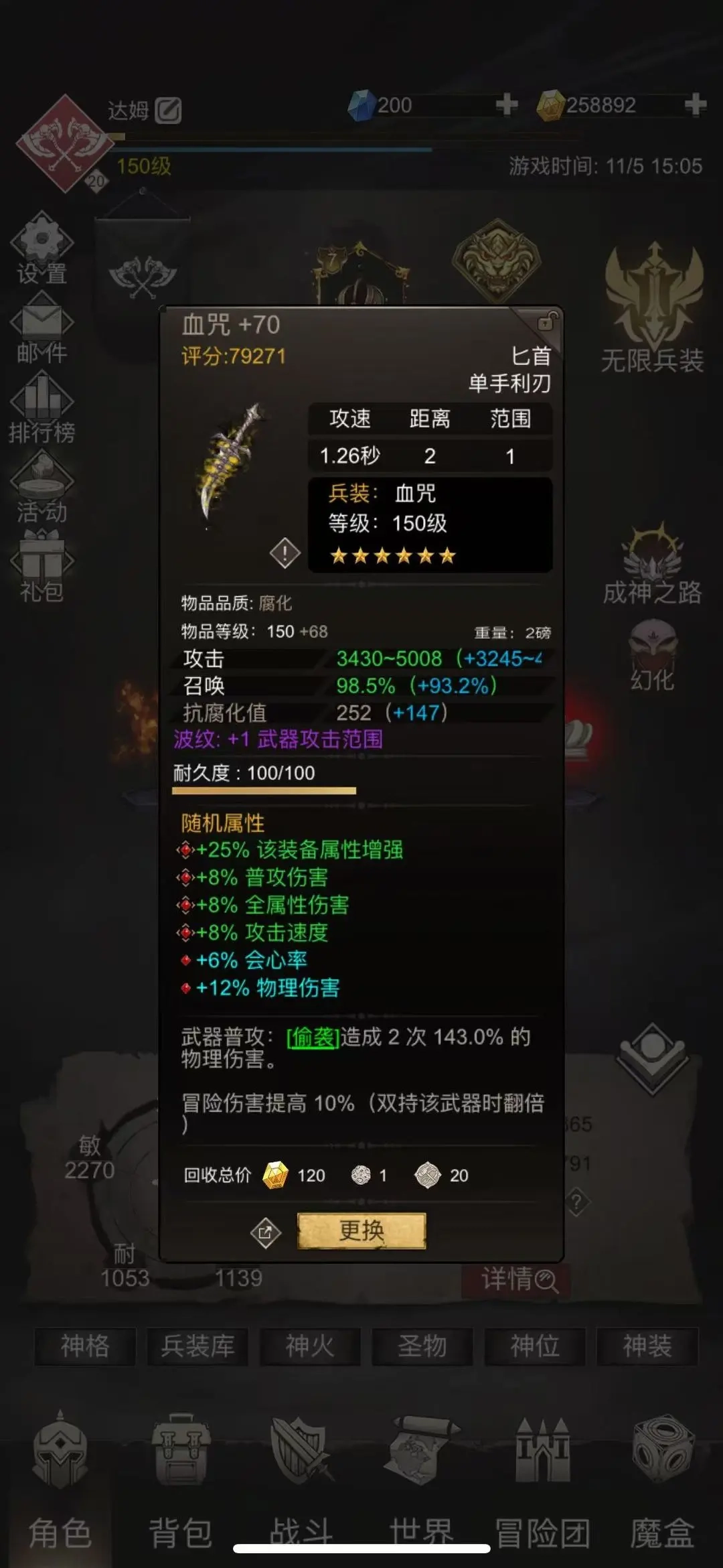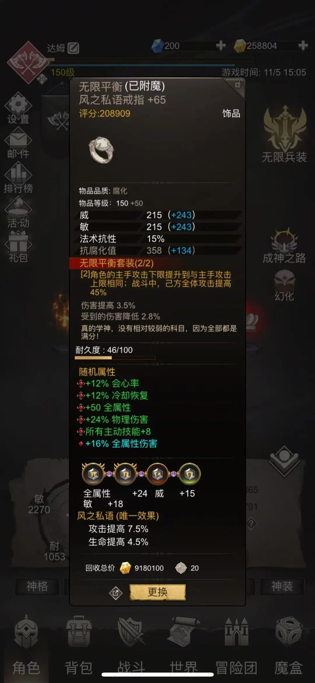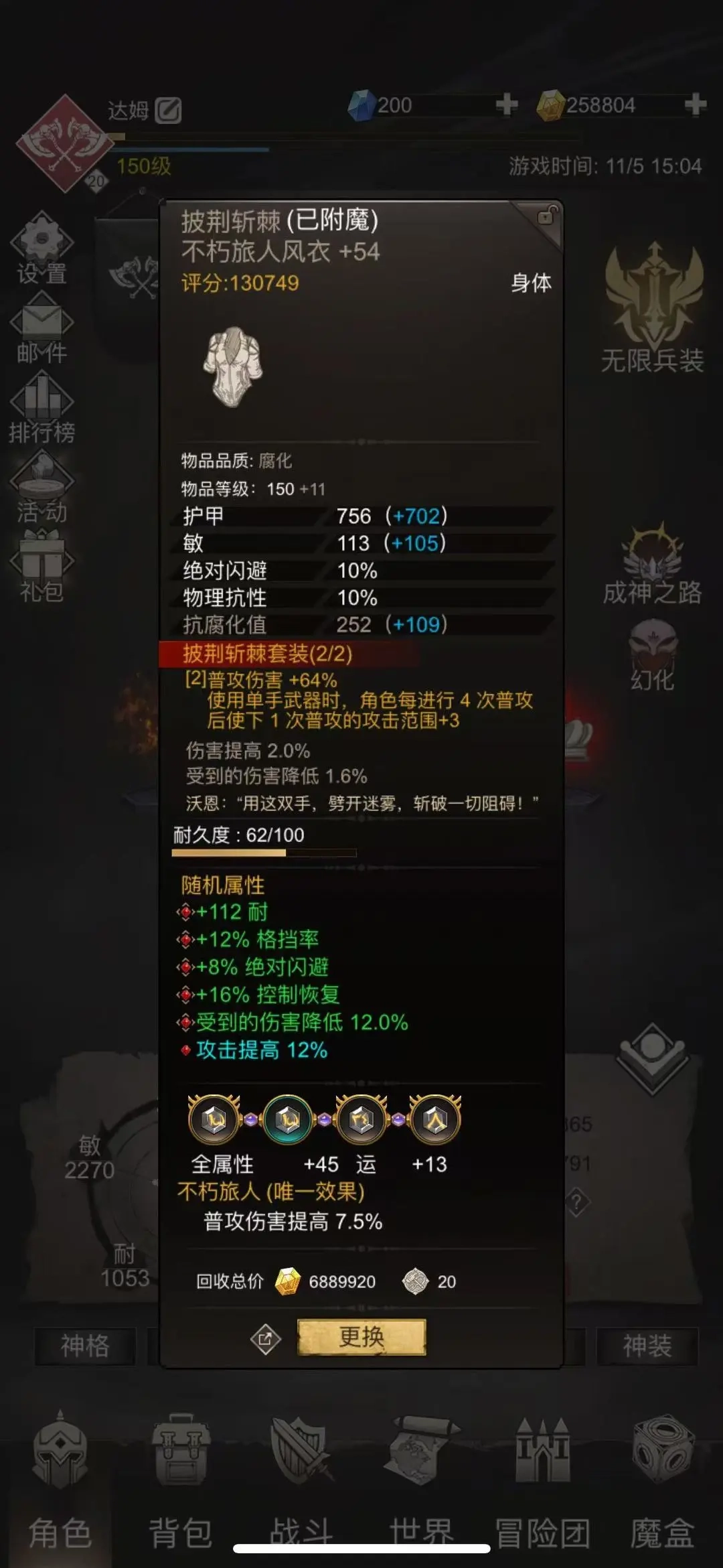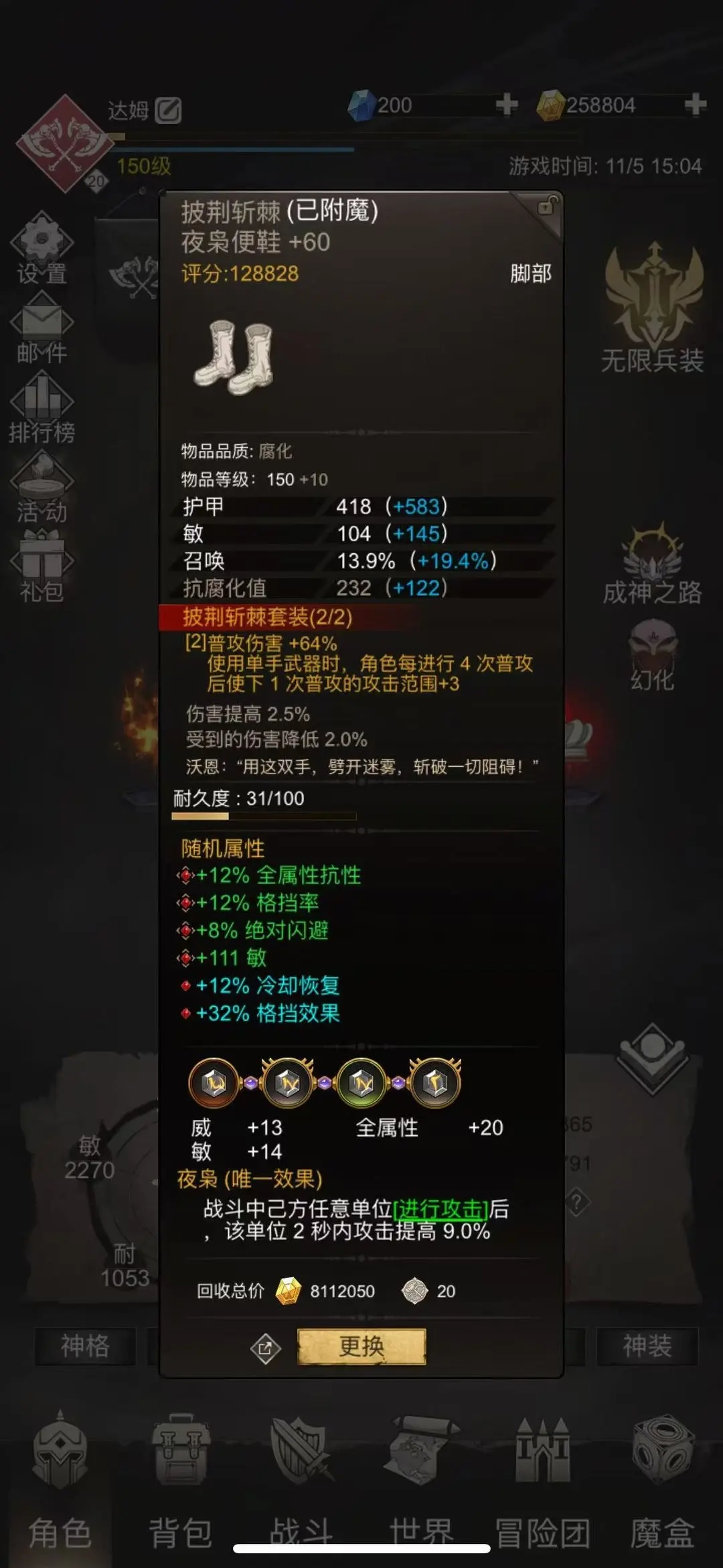 第五阶段会比前面轻松不少,毕竟第四阶段结束后已经拿到双套装,加上前四阶段在其他各方面的积累。这个阶段的核心任务是查漏补缺,进一步强化阵容:副职业要把暴走、时光穿梭、黑龙这类关键技能拿到手;词缀没满的话继续收集;装备持续更换成更强力的;武器等级也得接着提升。等打到最终BOSS关卡,如果本体坦度不够,就带双前排阵容;要是本体够硬,直接搭配暴走+时光穿梭/黑龙的组合,一波就能带走BOSS,顺利结束。