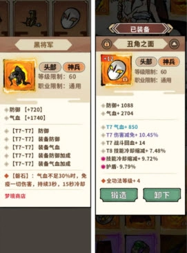头盔方面有丑角之面和黑将军这两个选择:丑角之面更偏向输出属性,黑将军则侧重于生存能力,大家可以根据自身的实际情况来选择佩戴。