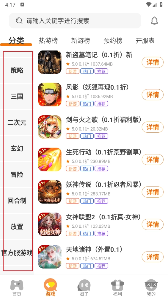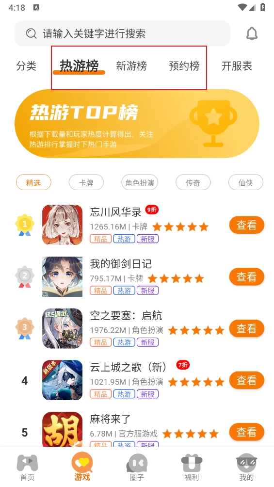 点击游戏榜单进入,可以好惨各类游戏的排行信息。