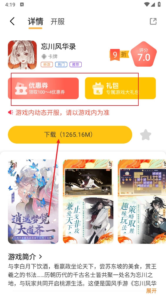 接着一键打开游戏进入详情页,就能查看相关优惠券,点击“”后即可安装畅玩。