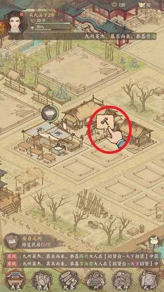 选择一块空地,点击锤子图标,消耗金币即可建造新的民居。施粥后获得安置资格的流民能够迁入这些新建民居,这会增加城镇人口数量,进而推动玩家等级的提升。