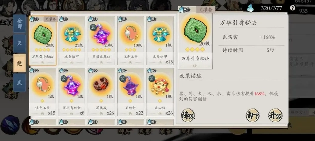 这个套路的核心目的是为了频繁触发诀字神兵,所以自然要从中挑选最强、最顶尖的。万华引身秘法开启后能提供五秒的全面高额增伤,并且前两三秒的负面效果还会转化为正面的双倍反伤,差不多能清空周围的妖兽,后续也就不用怕被妖兽攻击了。