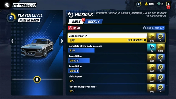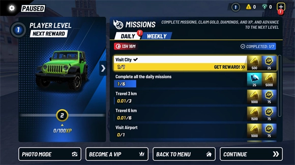 点击右上角的暂停按钮可查看待完成的任务,完成每日任务与每周任务均能获取奖励。