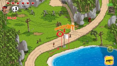 2、到达【CHECKPOINT】旗帜检查点,激活进度保存功能,留意沿途敌人,使用武器清除障碍以确保安全通过。