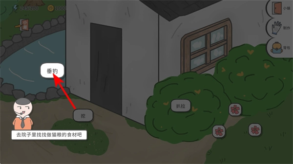 2、点击垂钓按钮,就能在院子的池塘里钓鱼来获取食材,这是丰富猫粮食材的核心操作,垂钓过程中需要耐心等待鱼上钩。