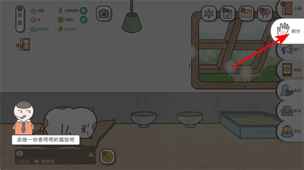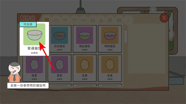 3、点击制作按钮,就能进入制作台制作猫饭,这是喂养猫咪的关键环节,制作过程中要挑选合适的猫饭类型,比如普通猫饭。