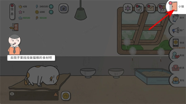 1、在游戏里点击小镇按钮,就能前往院子寻找制作猫粮所需的食材,而获取猫粮原料的关键操作,要留意院子中的资源分布情况。