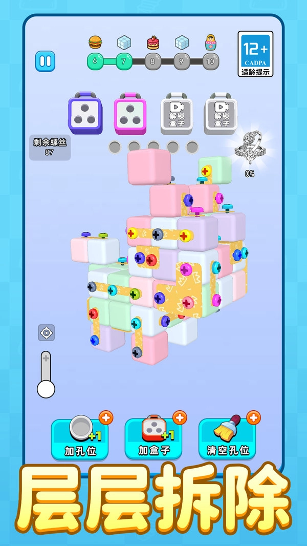 打螺丝高高戏旧版本是一款解压感拉满的休闲益智游戏!它的核心玩法是趣味十足的拧螺丝模拟,你得依据关卡里螺丝的摆放布局,把场景中的螺丝进行合理拆除与组合消除,轻松感受打螺丝带来的别样乐趣。这款游戏格外适合热爱逻辑挑战、大脑测验以及智商类游戏的玩家,操作简单容易上手,还有海量丰富关卡等着你来解锁。你能够自由开启挑战,将各类螺丝拧下并放置到合适位置,越玩越能锻炼自己的思维逻辑能力!