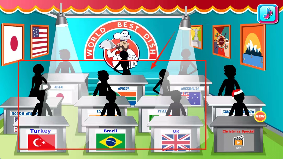 2、你可以从亚洲、非洲、欧洲等不同区域里挑选自己喜欢的国家料理,要是感兴趣的话,也能参加右下角的圣诞特别活动,以此来确定烹饪的主题。