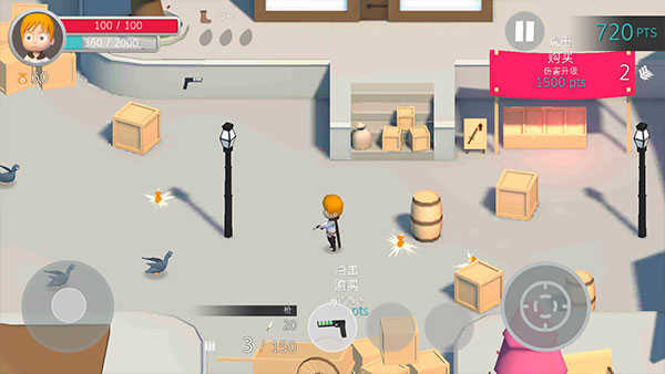 3、进入游戏后,角色会出现在城市街道上,周围会持续刷新前来攻击的鸽子。你可以通过虚拟摇杆控制角色移动,点击屏幕进行射击,需要及时消灭敌人并拾取掉落的资源,以此维持生存状态。
