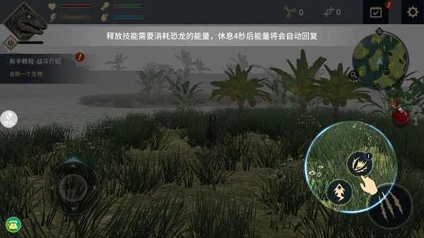 1、完成游戏存档创建后进入游戏,开启新手教学模式。左侧虚拟摇杆可操控恐龙移动,右侧下方为攻击按钮,其左上方是技能按钮。释放技能需消耗恐龙能量,通过休息恐龙能量会自动恢复,可尝试操作体验。