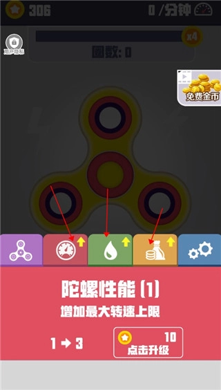 3、还能使用金币升级陀螺,以此提升它的性能、润滑度等各项数值,让它变得更持久。
