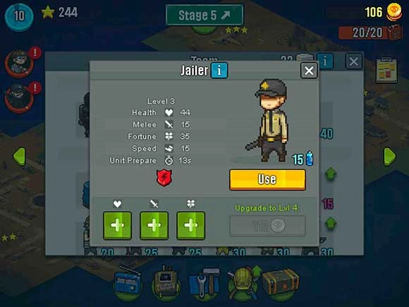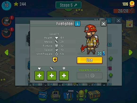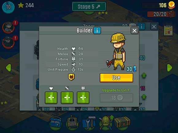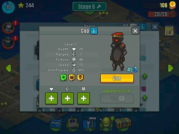 卡车的升级仅需消耗金币,而士兵的升级则相对复杂:血量、攻击力与幸运值这三项属性的提升,都需要各自获取对应的补给道具才能完成升级。