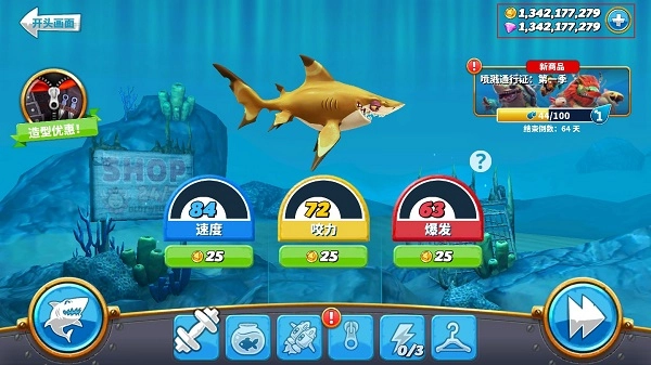 给你的鲨鱼装升级超酷装备,让它咬合更强劲、游动更迅猛,变得更贪婪!每只准备出击的鲨鱼都需要耳机、雨伞和超炫的喷射背包!
