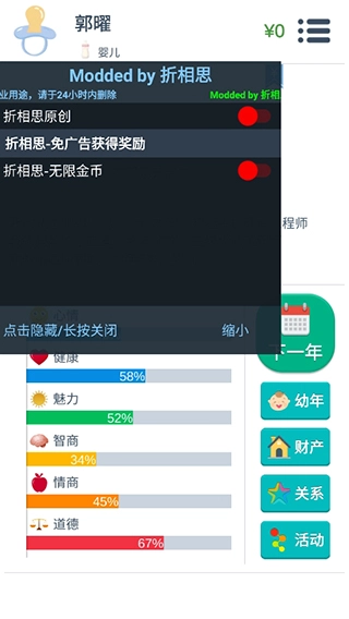 当然,人生也不乏挑战:小时候若生病未妥善医治,可能会留下伴随一生的后遗症;而当健康状况恶化、医治无效时,游戏便会以“死亡”宣告这一轮人生的结束。PS:本站提供的是第二人生游戏,我们对游戏菜单进行了修改,玩家可以通过的方式获取奖励和使用修改功能,此外还能通过直接获得满级属性。