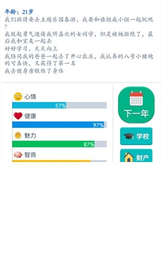 人生模拟涵盖了诸多层面,比如各类活动、人际关系以及财产状况等,包含的内容相当丰富。