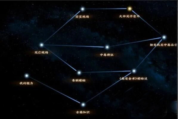 在启动分析流程后,针对死亡相关场景,依次选定了封闭空间场景、毒物导致的迹象、铜制蛙形器物这几个方向;同时启用了对古代文献的认知储备这一技能,最终达成了将事物拆解剖析的成就解锁条件。