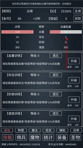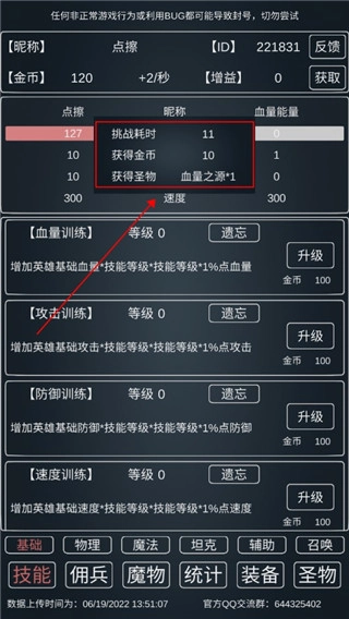 当攻击数值达到200以上时,就可以先将剑圣解雇。之后等金币积攒到11.1万,升级4级速度属性,就能让攻击和血量的刷新间隔缩短至3秒。刷新完成并记录下数据后,就可以洗掉速度属性,重新加点到剑圣身上了。