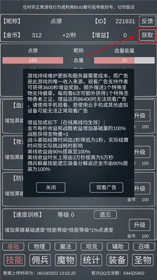 游戏开始时先进行挂机操作,积攒生命值和能量值。留意界面右上角增益相关的获取入口,这里可以通过观看广告来获取增益。初始阶段有一分钟的冷却限制,冷却结束后要立即点击。这款游戏的广告是必须观看的,每天最多可以观看16次。