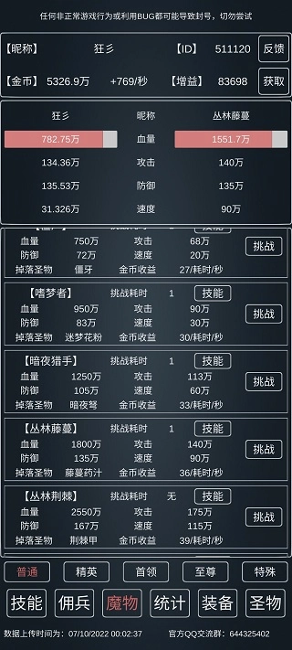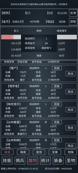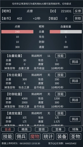 从勇者阶段开始就都是赌狗玩法速通了,打完就得刷十万个能量之源,一秒通关后建议离线挂机,在线状态通常不太稳定,等这些都搞定后才是游戏真正的开端,也是不同流派开始分化的分界点,下面这张图里我血量不小心叠太多了,所以防御就少叠了点