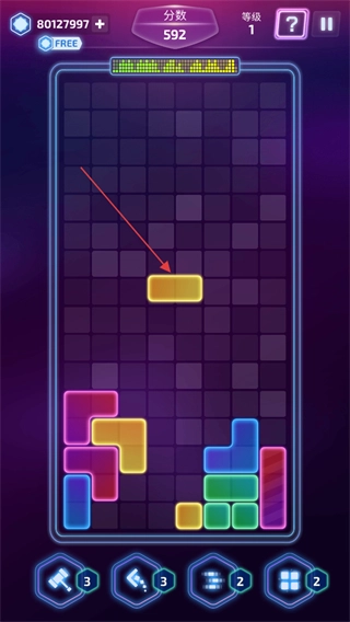 当方块连成完整的横排或竖排时就会消除并获得分数,另外还要注意下方道具栏里的道具,比如锤子图标。