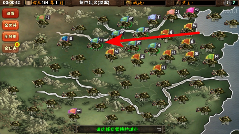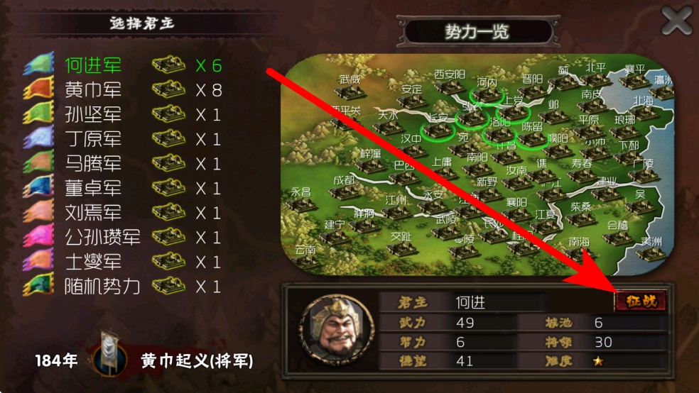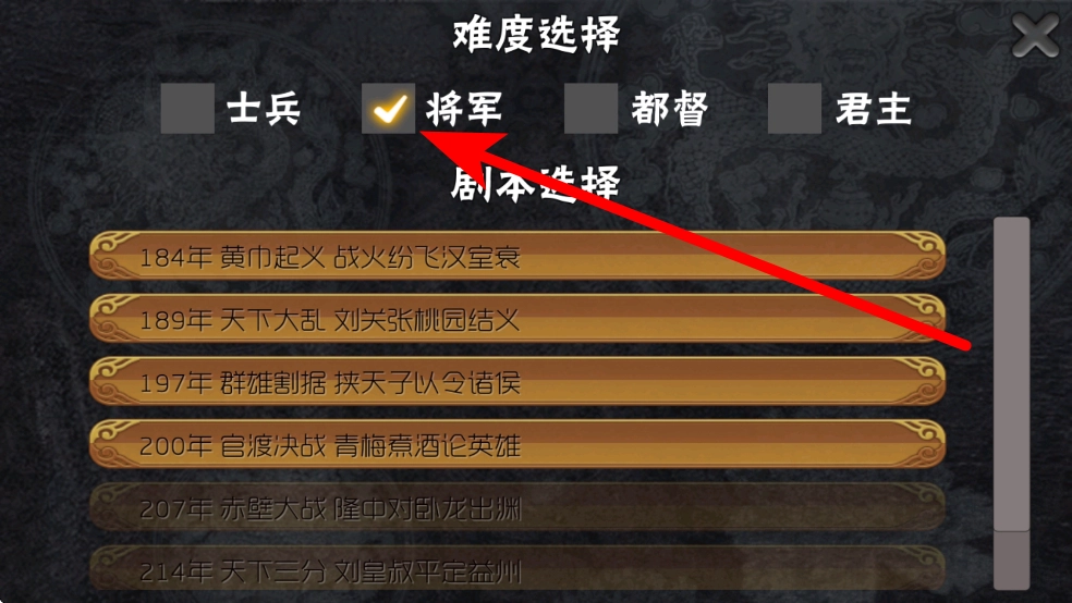 进入游戏后,先选择难度和剧本,例如将军难度搭配184年黄巾起义剧本,接着挑选心仪的君主与所属势力,点击征战按钮,即可开启这段充满策略的征程。