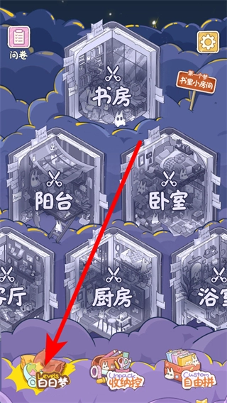 进入游戏后,在白日梦场景选择界面,可看到书房、阳台、卧室、厨房、浴室等不同主题空间,点击想打造的空间,就能进入该空间的造景界面。
