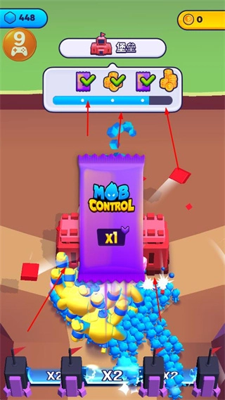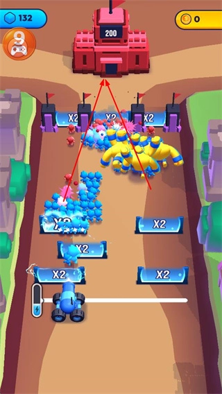 在关卡里,借助X2这类倍数装置,使蓝色小人的数量不断翻倍,以此扩大队伍的规模,为后续的进攻提供支持。