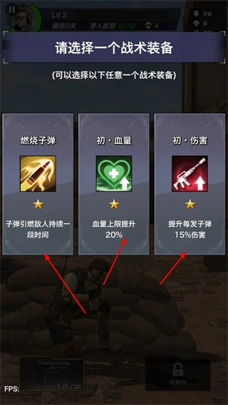 可以选择燃烧子弹、初始血量、初始伤害等战术装备,以此增强战斗能力。