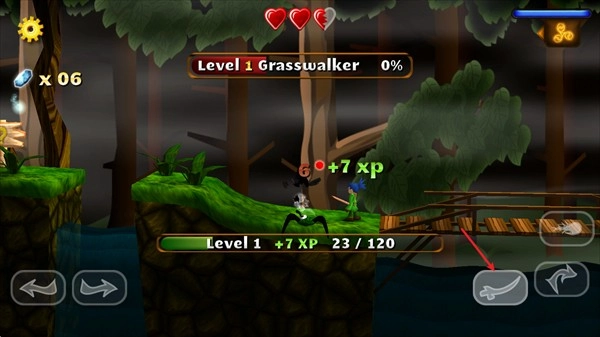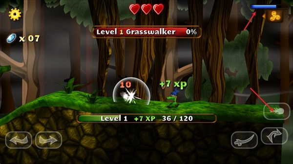 就像图中右下角展示的那样,那个带有魔法弹图标的按键就是魔法攻击键,点击它就能发动魔法攻击。屏幕右上方有一条魔法能量条,当蓝色的能量条数值变为0时,玩家就没办法释放法术了。不过能量条会随着时间自动恢复能量,另外,玩家也能在游戏里找到小蓝瓶,使用后可以直接把能量补满。
