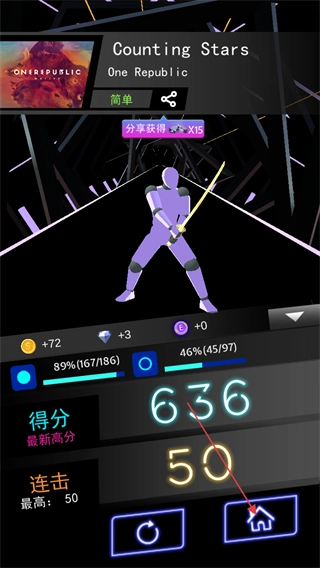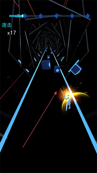 根据方块袭来的方向与角度,点击屏幕来操控角色挥剑击打方块,以此获得连击数,例如连击x17。