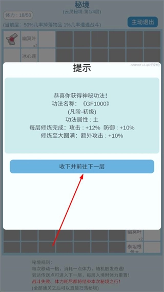 在秘境里能获取神秘功法,点击“收下并前往下一层”,就能继续深入秘境进行探索。