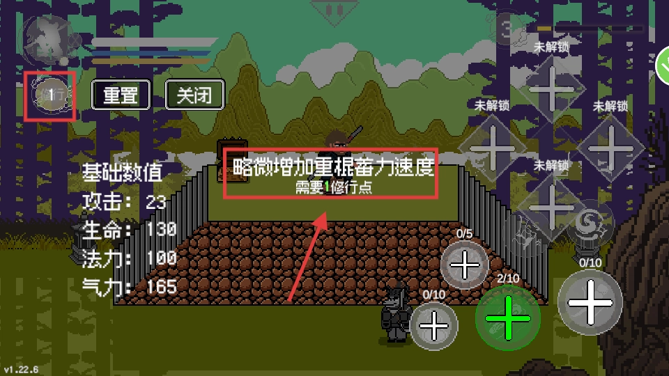 在【修行】界面,消耗【1-修行点】来升级【重棍蓄力速度】,以此提升战斗效率。