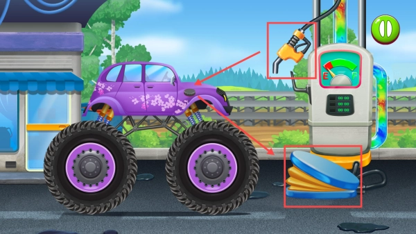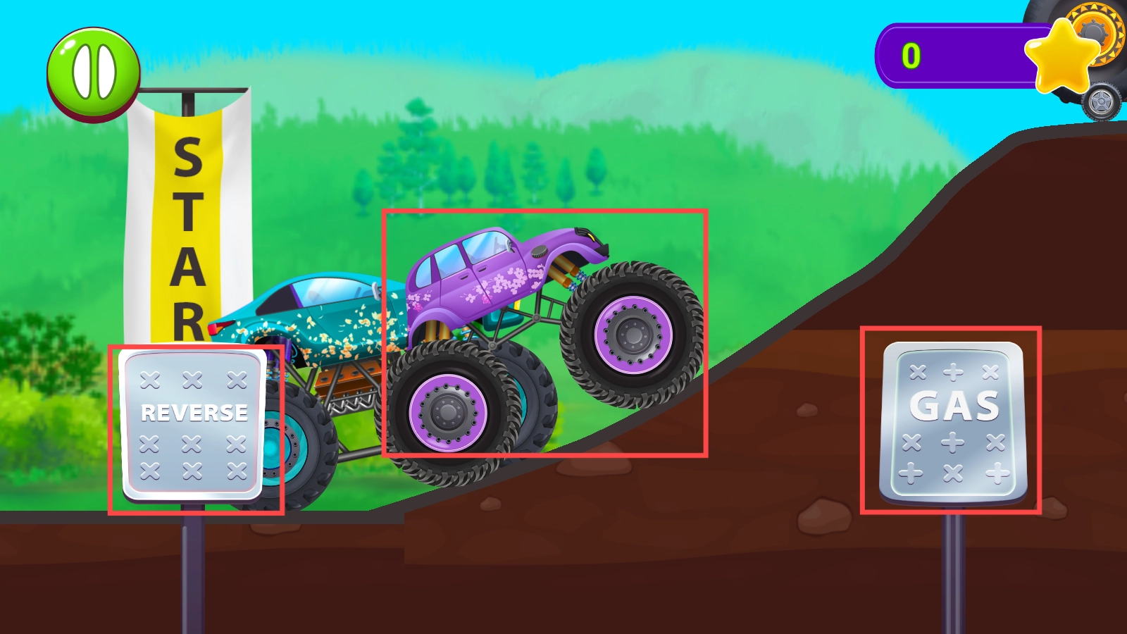 在竞赛环节,点击【GAS】键加速、【REVERSE】键倒车,操控紫色卡车翻越山坡,冲向终点。