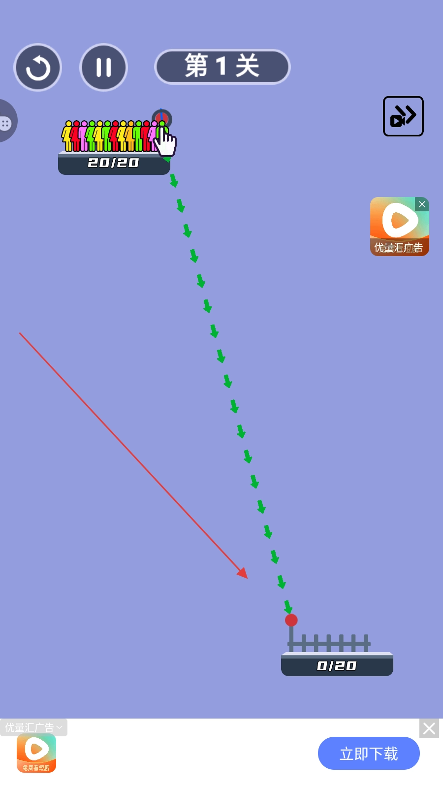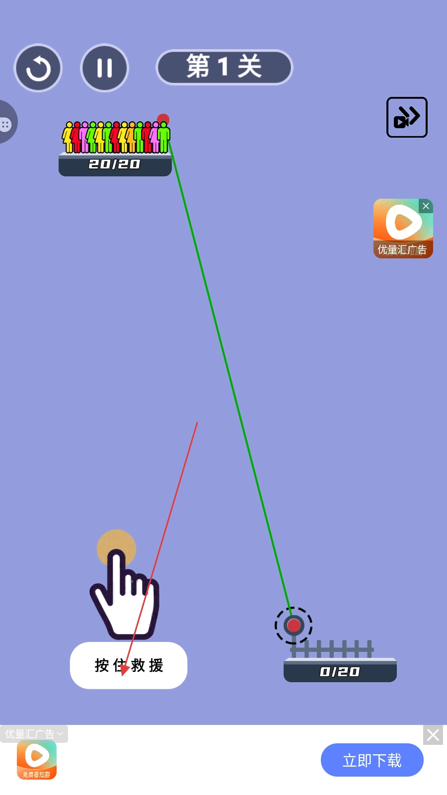 长按屏幕使人群顺着绳索移动,所有人抵达安全区域就能通关。