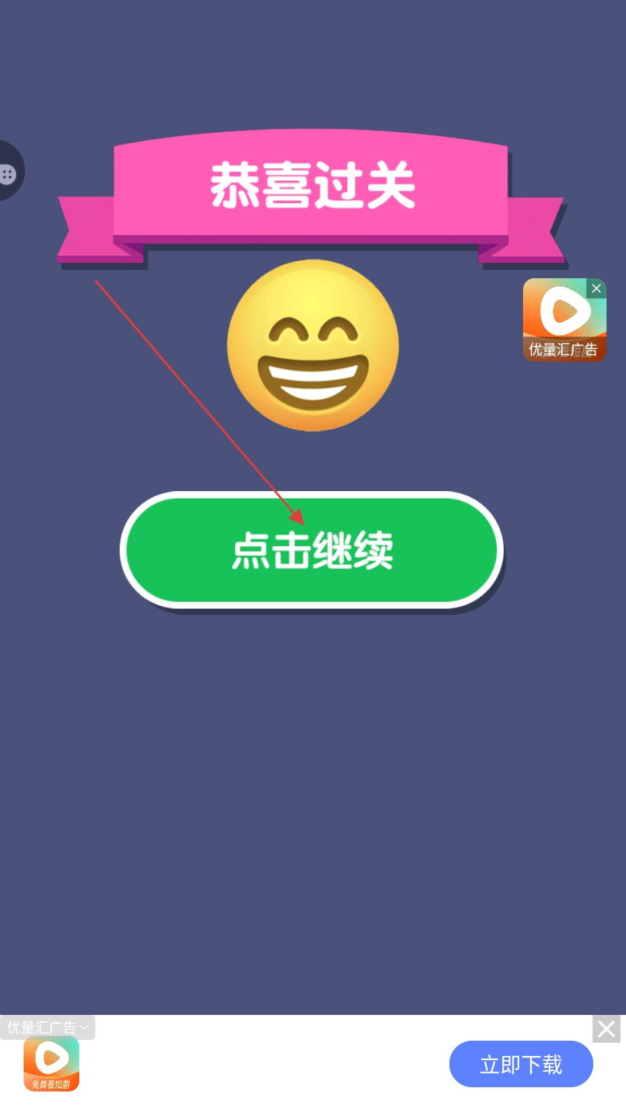 通关后点击【点击继续】,解锁新关卡。