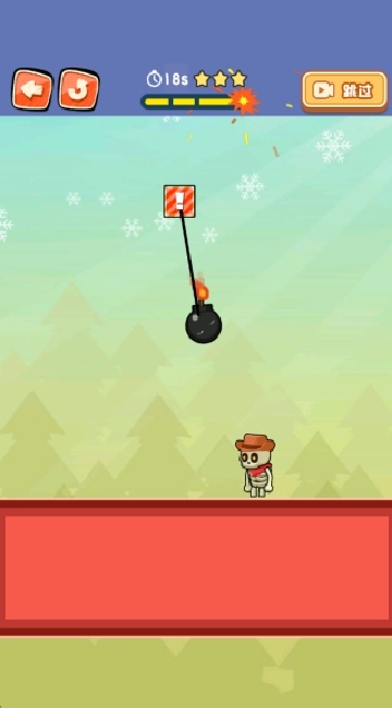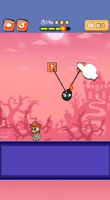 3、第12关解锁绳索炸弹,通过点击切断不同位置的绳结来控制炸弹的下落轨迹,借助场景重力完成二次弹射攻击。