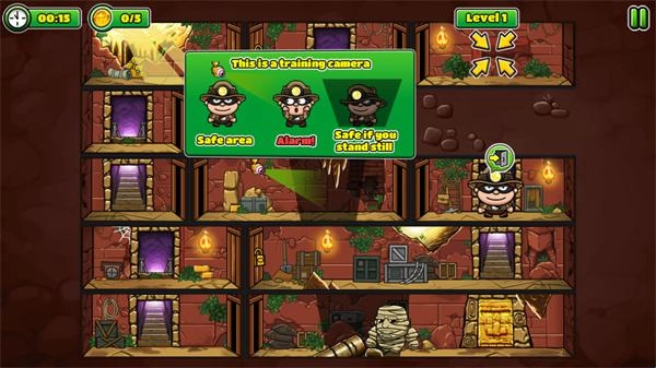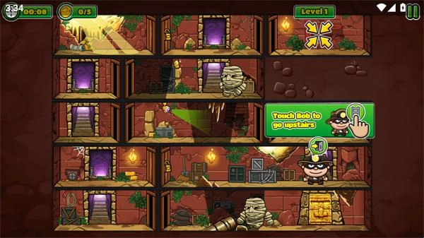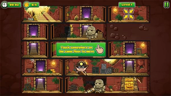 这是一个超有趣的玩法哦!你只需要点击屏幕,就能让鲍勃向前移动啦。记得仔细观察路线,找到能通过的门进入下一个房间。途中会遇到各种机关,得动动脑筋想办法过去,而且每种机关的方法都不一样呢。要是碰到木乃伊,得趁它没留意的时候把它打晕;有锁的门就用万能钥匙打开;有摄像头的地方一定要小心躲避;遇到电梯的话,得去别的地方找找密码才行。还有好多障碍等着你来解锁,当然啦,最重要的就是收集金币啦!