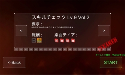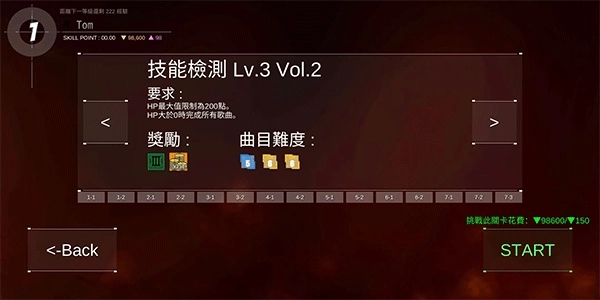 ①技能检定:和音游里的段位系统有些相似,它总共设有七个等级。每个等级都要求连续演奏3到5首歌曲,并且这些歌曲的生命值是共享的,只要能在演奏过程中保持存活状态并完成所有歌曲,就算成功通关。