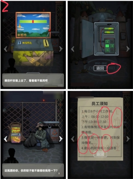 用游戏币玩游戏机兑换啤酒,将啤酒交给酒鬼后,借助他的钳子从垃圾桶中取出纸张;根据纸张上的“LONELY”获取6个图形密码,输入寄存处的密码锁可得到咨询处钥匙。需要注意的是,在打开咨询处的门之前,记得把铁盒子里的电池取出来。