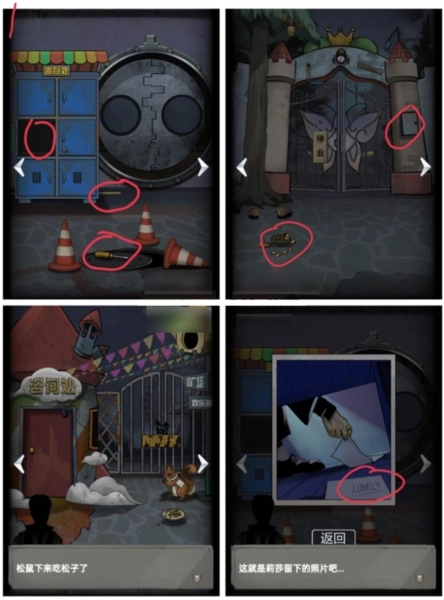 1、完成新手指引后,用钥匙打开寄存处获取锤子,同时在地上捡到棍子与螺丝刀。返回大铁门处,先在左侧用棍子和锤子取得松子,再到右侧用螺丝刀打开铁箱。接着在咨询处旁的碗中放入松子,得到新钥匙,用这把钥匙再次打开寄存处,就能拿到操控杆和关于“LONELY”的线索。