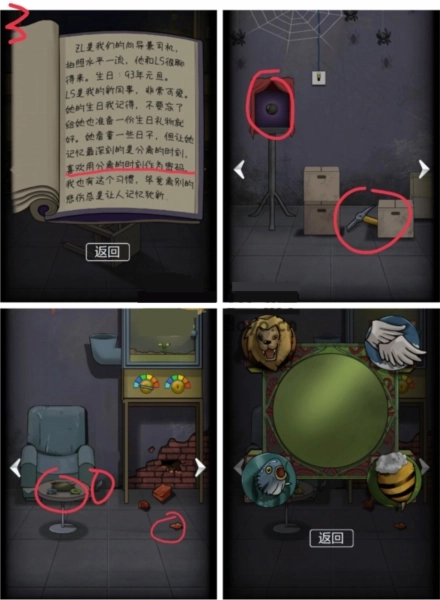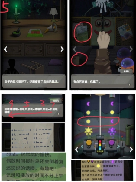 4、用胶带把门外的电线粘好,进门后打开大灯。找到墙上4个蜘蛛所在的位置,打开门口的盒子获取蜡烛,将蜡烛放置在书桌的烛台上并点燃,随后关掉台灯会得到提示;结合蛛网上的飞虫以及墙上红、紫、蓝、绿的痕迹,推导出四个图形密码,用该密码打开门口的柜子就能拿到生长素。