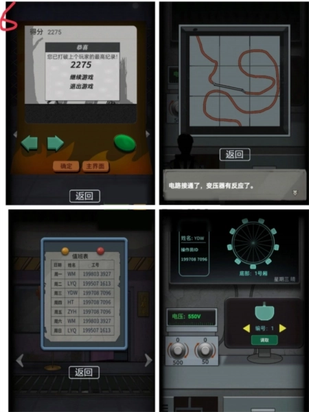 用钥匙打开控制室的柜子,把拼图拼好后接上铅笔芯。将旋钮安装到右侧的变压器上,再把电压调整到550。在1号包厢里捡到纸片3,把3张纸片拿到控制室门上拼好,看到显示屏显示今天是星期三,最后输入对应的工号。