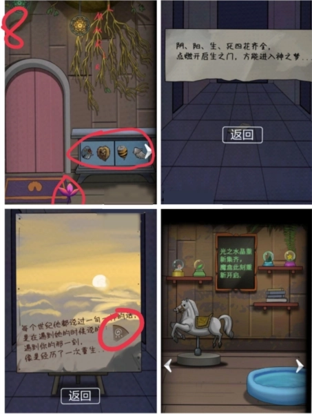 床的旁边拿到阳之花、水晶球2和火柴。在门的入口处放飞蝴蝶,跟随蝴蝶获取生之花。出来后,沿着唯一带有绿叶的分叉方向走一遍,会得到提示“四花齐全,点燃”以及一张提示图——白色太阳的右上方有个图案,走到尽头就能拿到水晶球3和光之魔盒。