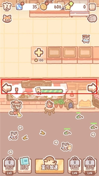 1、进入游戏后,你可以借助左右两侧的箭头切换房间——左侧是面包制作区,右侧则包含面包售卖、发放传单招揽客人以及休息室等功能区域。