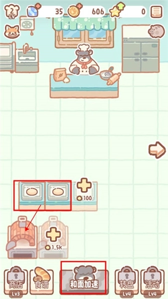 2、在厨房场景中,玩家若想加快糕点制作进度,可通过连续点击下方的“和面加速”按钮,或者直接点击熊师傅来实现;制作完成的糕点会显示在下方的格子内,此时需要将其拖动到下方的灶台处才能进行烹饪。