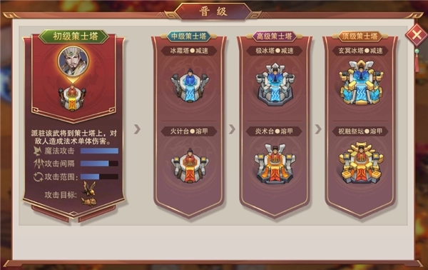 中级、高级、顶级箭塔的晋级开启条件分别对应武将等级达到10级、30级、45级。正如其名,箭塔的级别越高,相应的攻击伤害与攻击范围也会随之提升。(主公,还请努力战斗升级呀!)